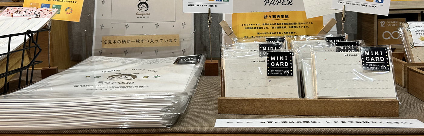 以前、紙製クリアファイル&折り鶴ペーパーのメッセージカードをご発注いただいた(有)蒲生電気工業所様から、倉敷市天城にある洋菓子店、Le・Foyer(ル・フォワイエ)様の店舗での店内カウンタースペースにて2023年3月から既存商品の委託販売を行うため、”他にも何かグッズ制作をしたい”というご相談を頂きました。