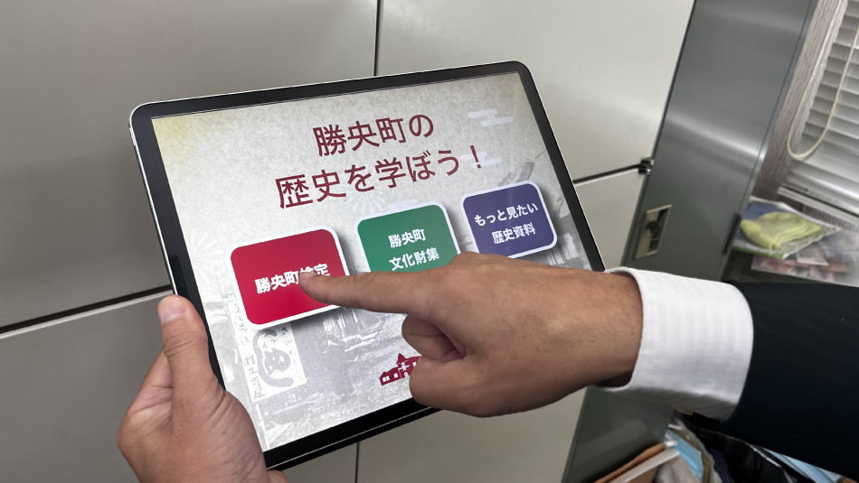 館内の学習コーナーでは、大型タブレット端末を利用して、「勝央検定」という3択クイズを設置し、地元勝央町に関する多分野にわたる学習ができるよう、学習システムを作成しました。